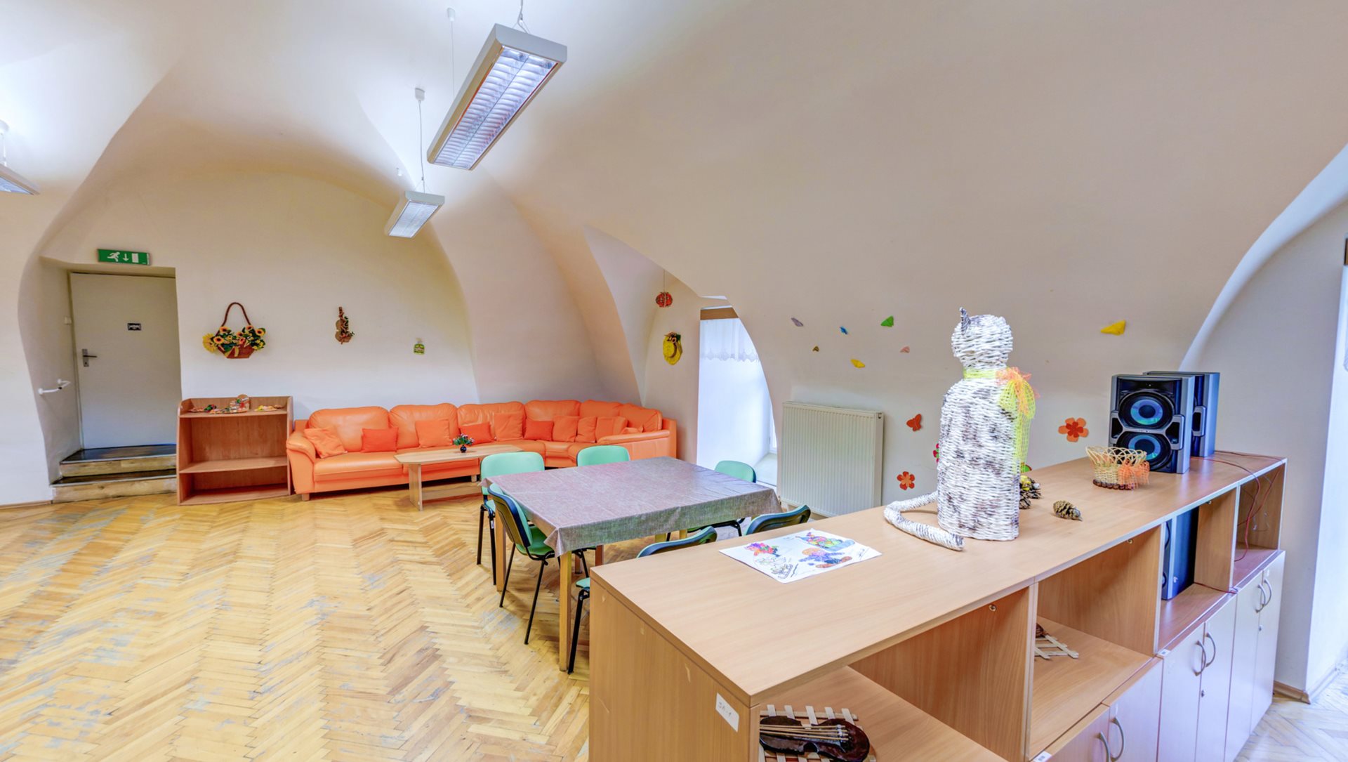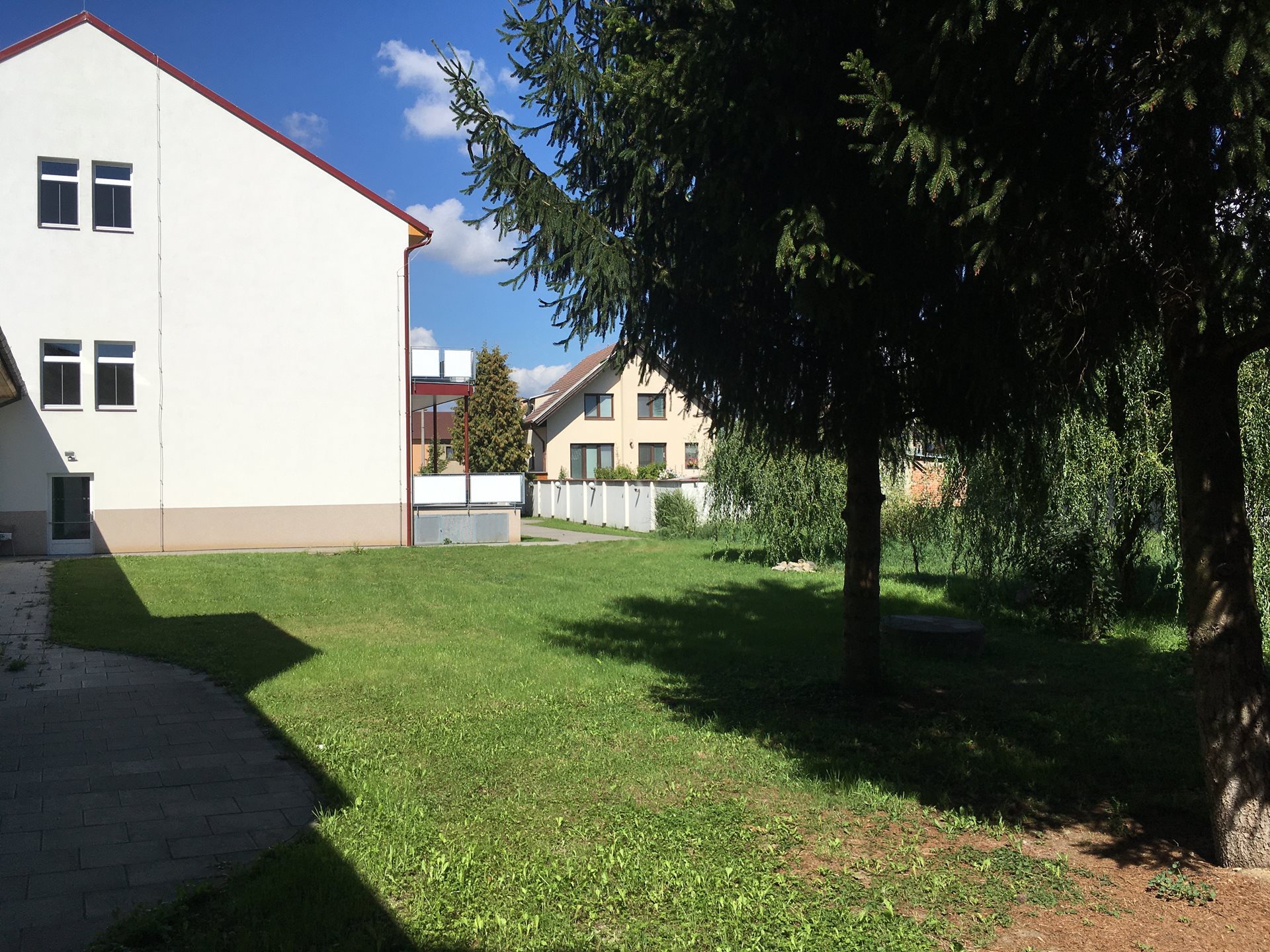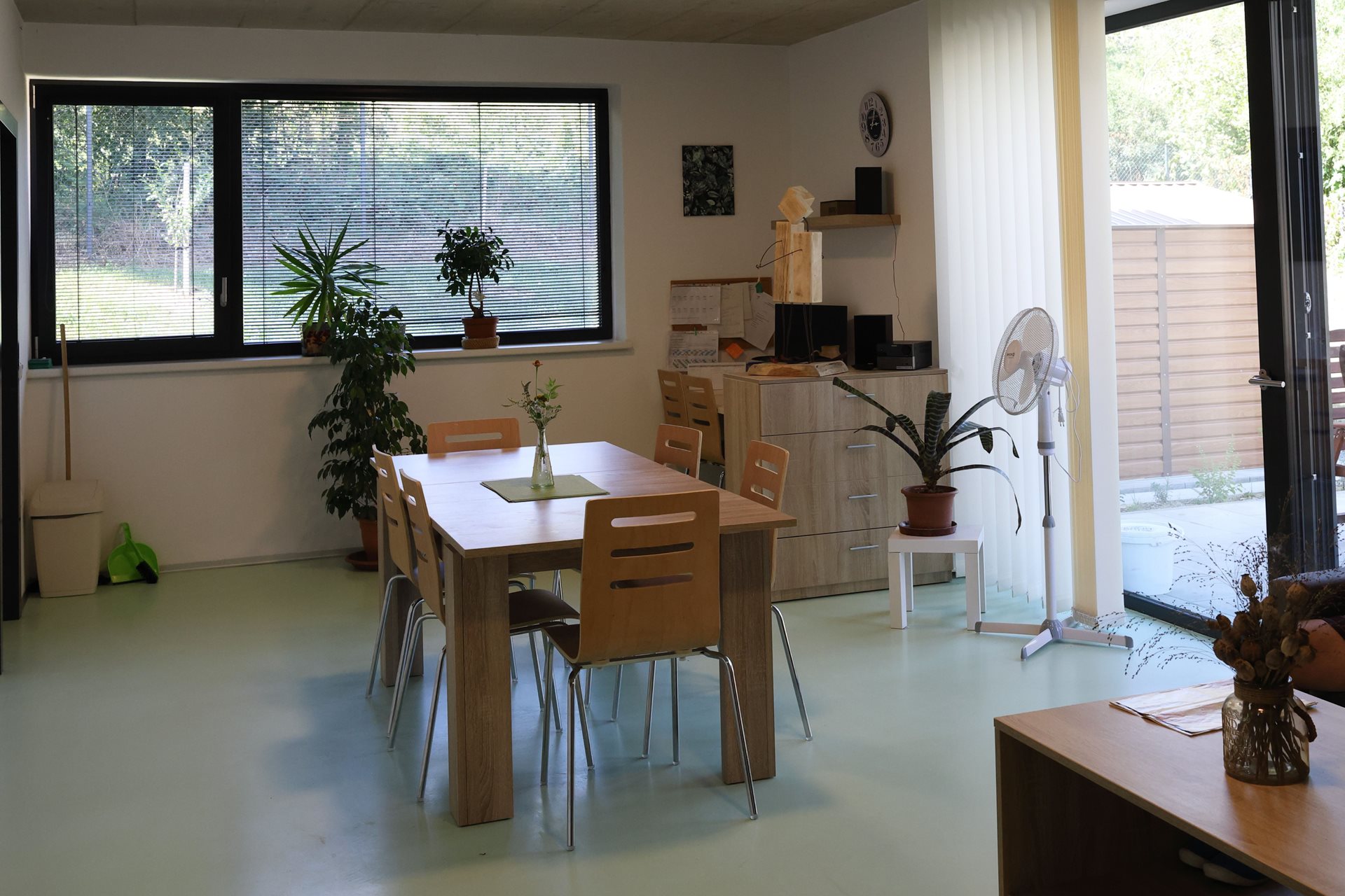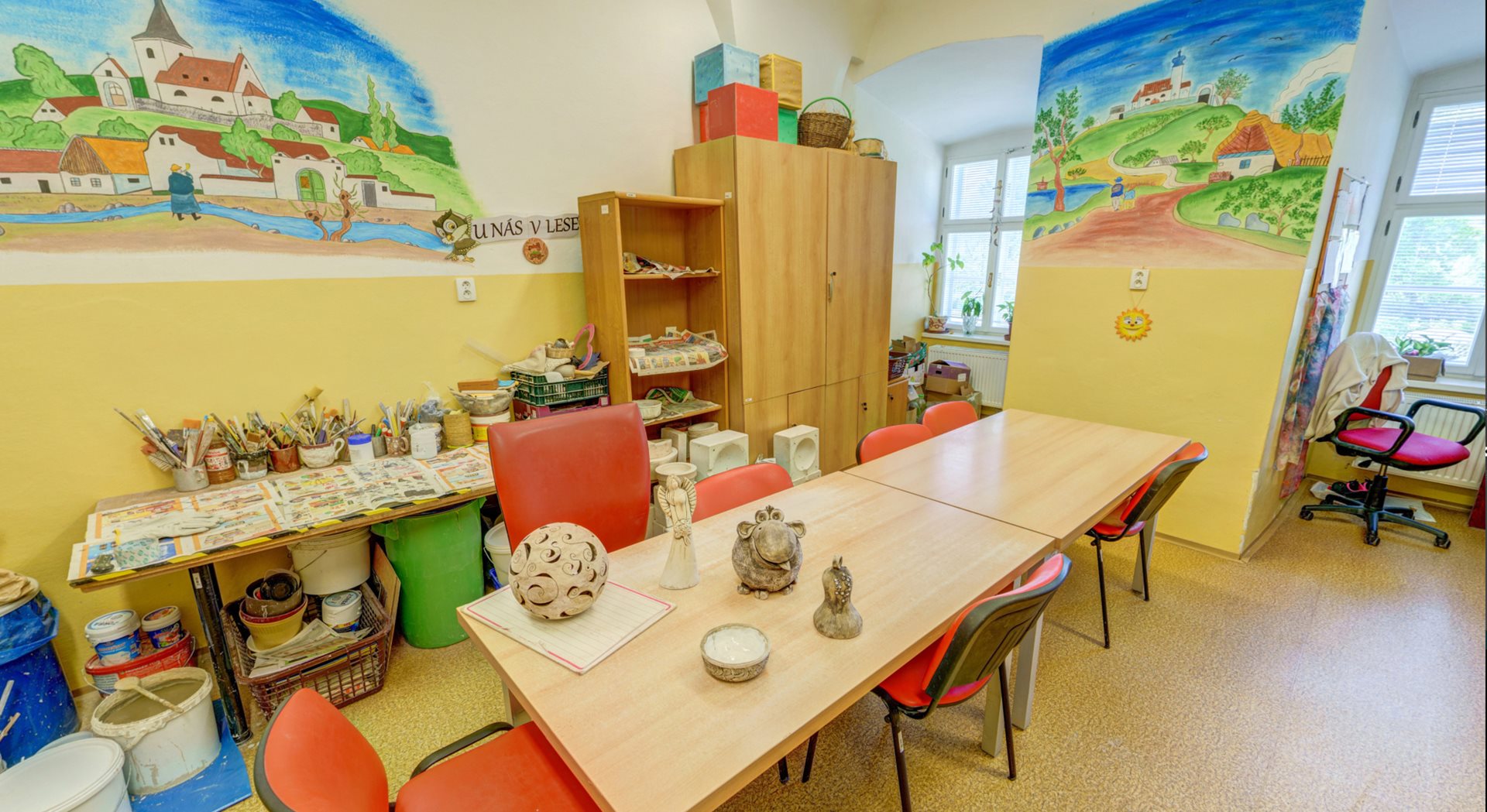 1. NP – chodba, kancelář, koupelna se sprchovým koutem a WC pro personál, šatna pro personál, tvořivá dílna, sklad, technická místnost, kotelna